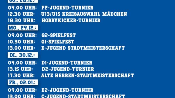 Samstag, 27.12.2025 9:00 Uhr: F1-Junioren-Turnier 11:30 Uhr: D-Junioren Stützpunkt-Turnier 17:30 Uhr Jungschützen-Turnier Sonntag, 28.12.2025 9:00 Uhr F2-Junioren-Turnier 12:30 Uhr U13-Juniorinnen-Kreisauswahlturnier